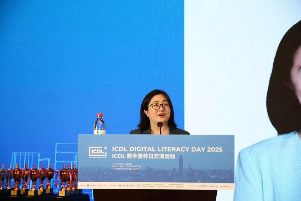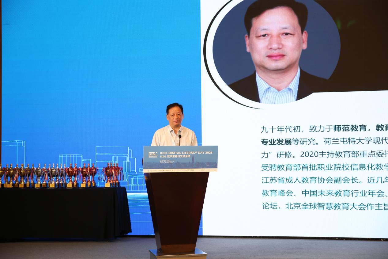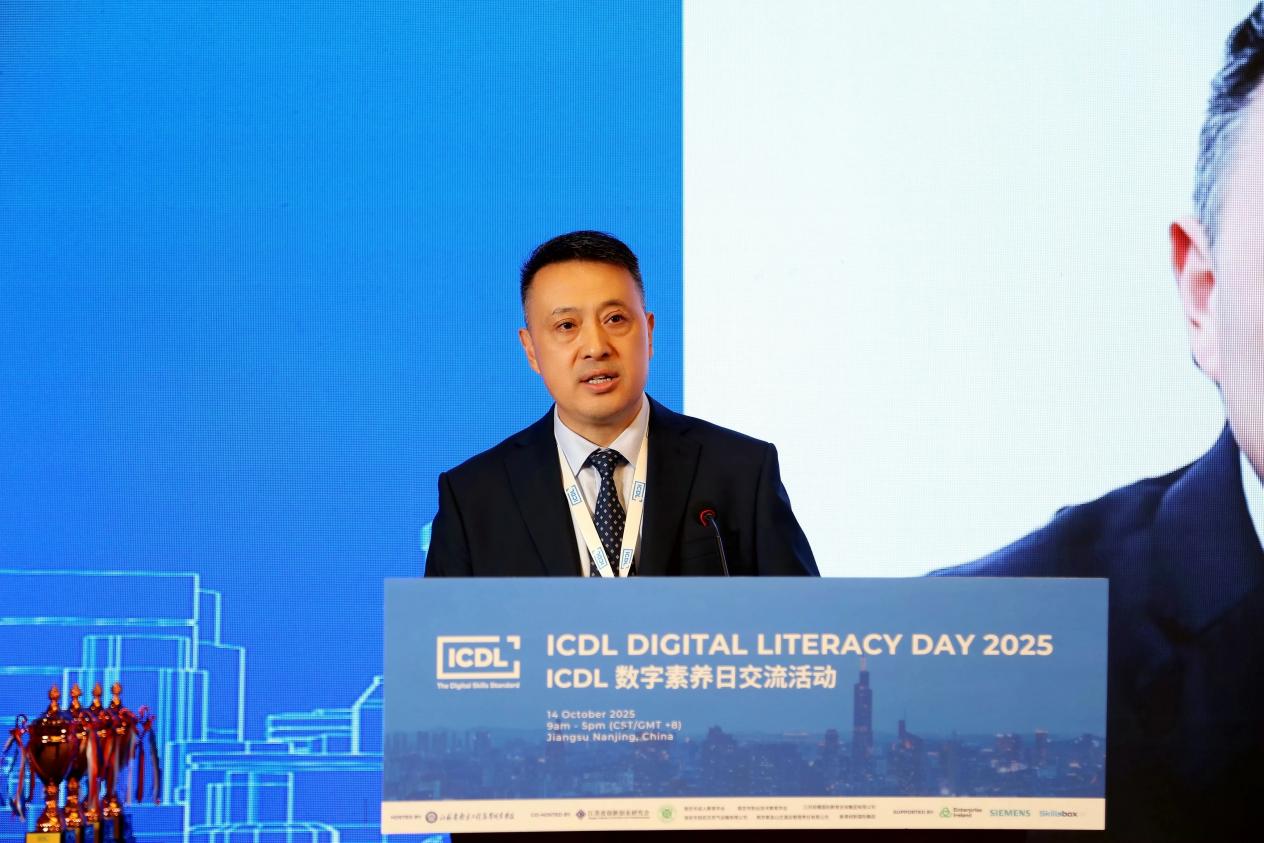 江苏省南京工程高等职业学校校长崔炳辉致开幕词。崔炳辉首先代表学校对各位领导、嘉宾的到来表示热烈欢迎,他表示,此次盛会既是数字素养教育领域的一次重要交流,也是推动职业教育国际化发展的宝贵契机。他指出,我校作为全国首家获国际数字素养认证授权的中国基地学校,近年来,积极响应国家教育数字化战略,以“数智赋能”为核心,以人工智能技术为驱动,系统推进数字化转型,数字化校园建设成效已全面显现。他强调,未来我校将继续总结数字技能培养经验,不断探索数字素养高质量发展路径,将数字素养赋能每个专业,把国际标准扎根本土课堂,以培养更多适应数字时代的高素质人才,为职业教育发展、为数字经济繁荣贡献更多的力量。