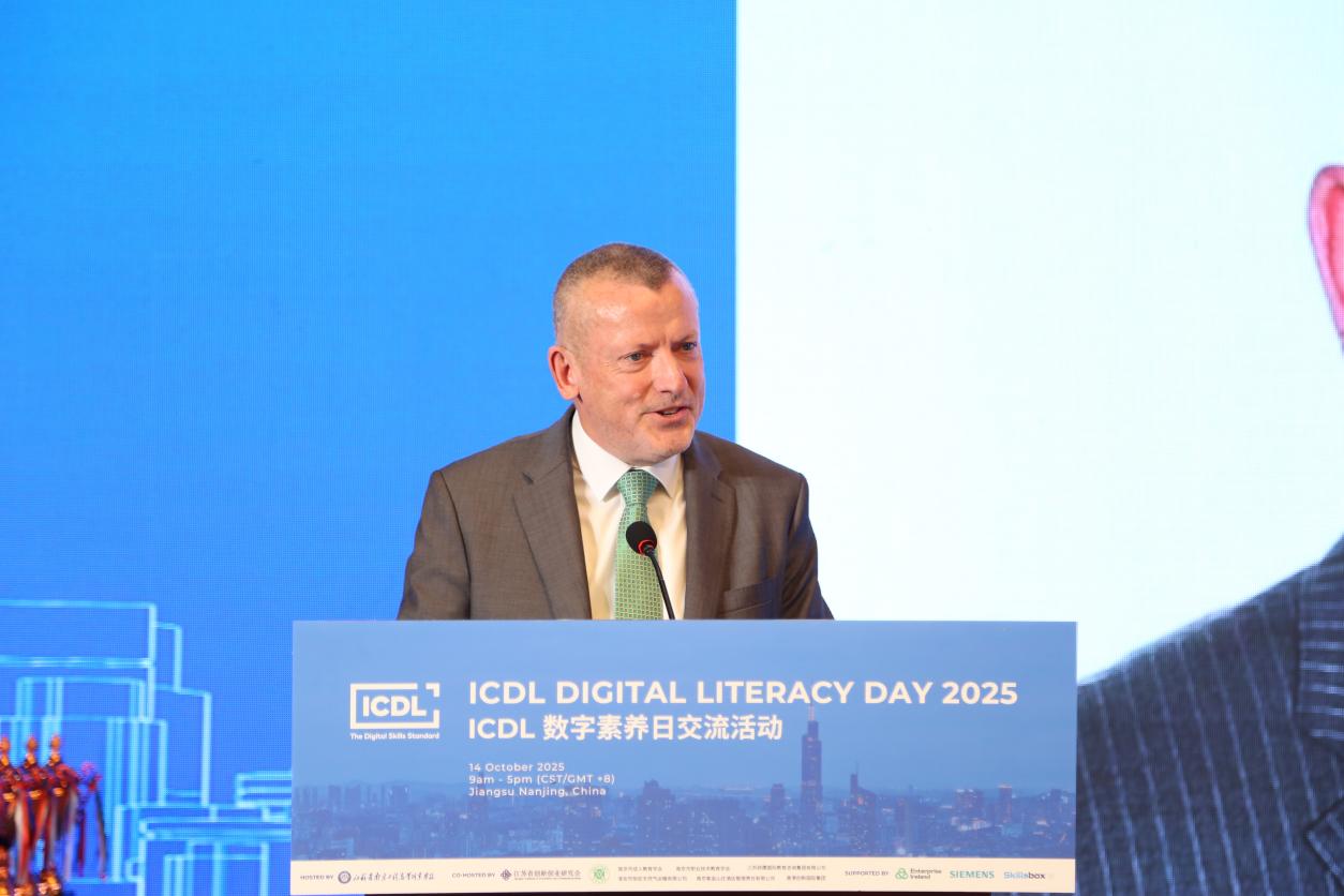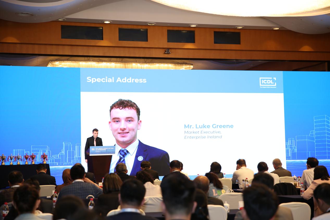 爱尔兰专家代表Luke Greene先生回顾了近年来中爱教育合作成果。他表示,目前,爱尔兰已与中国高校共建106个联合办学项目,分布在34个城市,在读中国学生逾万人。他指出,作为 ICDL 总部所在地,爱尔兰政府将持续支持国际数字素养认证在华发展,以国际化标准助力数字人才培养。