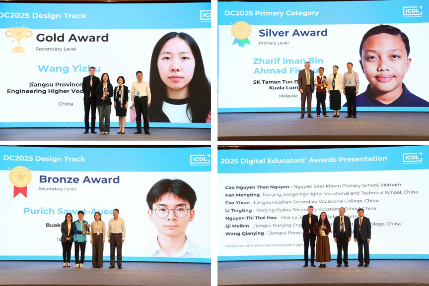 江苏省教育信息化与数据管理中心副主任李建芬与南京市教育局副局长田家英为获等奖学生颁发金奖;南京市教育局职业教育与社会教育处处长黄子亮与江苏省联合职业技术学院副院长金玉为获奖学生颁发银奖;南京市职教(成人)教研室主任章宏与南京市电化教育馆(南京市教育信息化中心)馆长张苏皖为获奖学生颁发铜奖;中国职业安全健康协会副理事长兼秘书长毕强与江苏省创新创业研究会常务副理事长陶雨生为获奖教师颁发数字教师奖;ICDL亚洲地区CEO吴天与ICDL总部 Damien O'Sullivan 为合作单位颁发优秀合作伙伴奖。