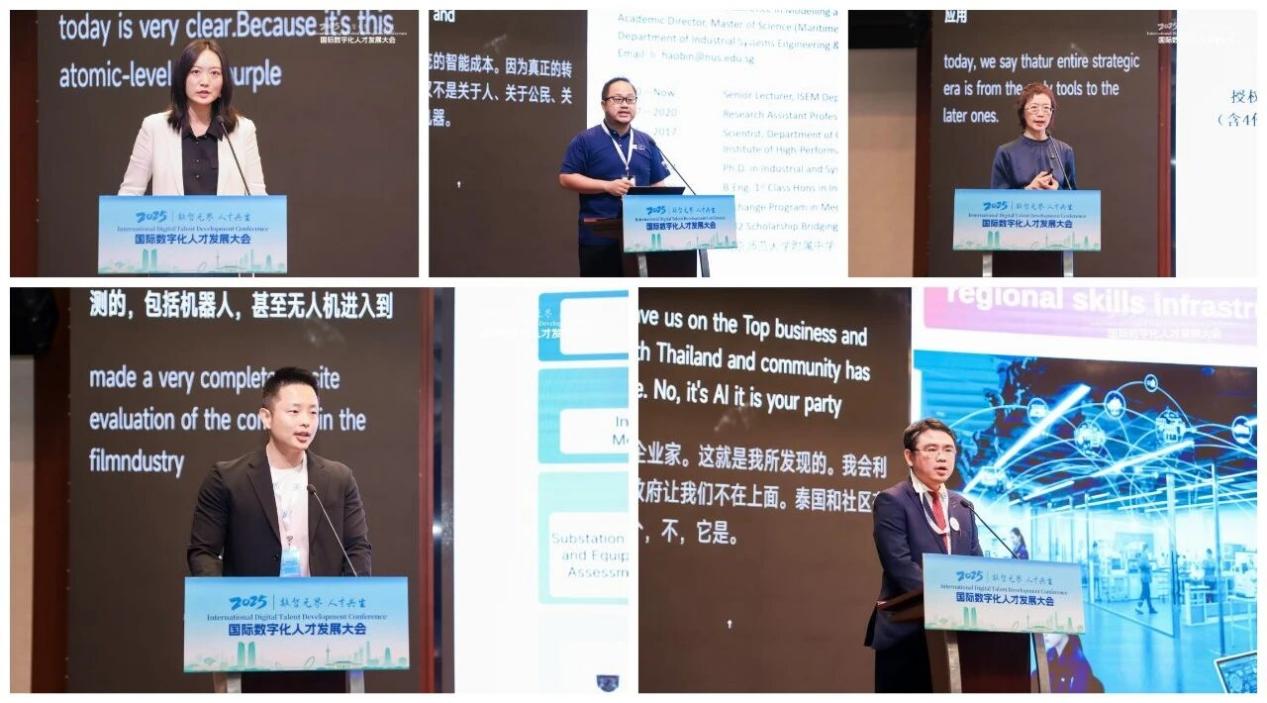在大会第三篇章“新实践”环节,金蝶软件刘俊珺、新加坡国立大学Dr. Li Haobin、硅基智能陈俐伶、Luna Technologies Global联合创始人Dr. Jacky Yu Jin以及泰国Business Competitive Intelligence总经理Mr. Thananpon Torsiriteatikul围绕AI赋能人才与组织变革带来了精彩分享。刘俊珺展示人力资源领域中碳基人类与数字员工相互协作的新解法,以AI重构人力资源管理体系,通过迭代“新三支柱”、落地外挂AI、内置AI与AI原生三大产品形态,推动HR从事务管控向战略价值伙伴跃迁,以数智化方案为企业提效赋能;Dr. Li Haobin从能力进阶、培养范式、技术驱动与区域协作四个层面阐述了数字智能时代的人才发展逻辑,指出数字能力与跨学科融合是未来人才竞争的核心,并认为南京有望成为区域数字人才中心;陈俐伶提出“为世界创造1亿硅基劳动力”核心战略,带来短视频、AI分身、直播与短剧等领域的数字人应用案例,以硅基生命驱动产业升级、实现科技平权;Dr. Jacky Yu Jin从AI从业者视角强调,AI行业既需要深厚的技术功底,也离不开对产业场景的理解,并呼吁通过企业与教育协同推动AI知识普及以缓解人才缺口;Mr. Thananpon则聚焦中新泰三边合作,提出应通过标准统一、技能共培与流动机制建设,推动区域间数字素养的互认与人才的自由流动。